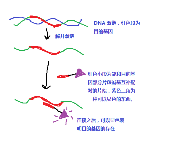 Con el pH, la temperatura y la fuerza iónica adecuados, la sonda de ADN puede formar puentes de hidrógeno con el ADN o ARN monocatenario no marcado complementario en la muestra que se va a analizar utilizando la alta precisión de la desnaturalización molecular, la renaturalización y el emparejamiento de bases complementarias. se combinan para formar un complejo de doble cadena.