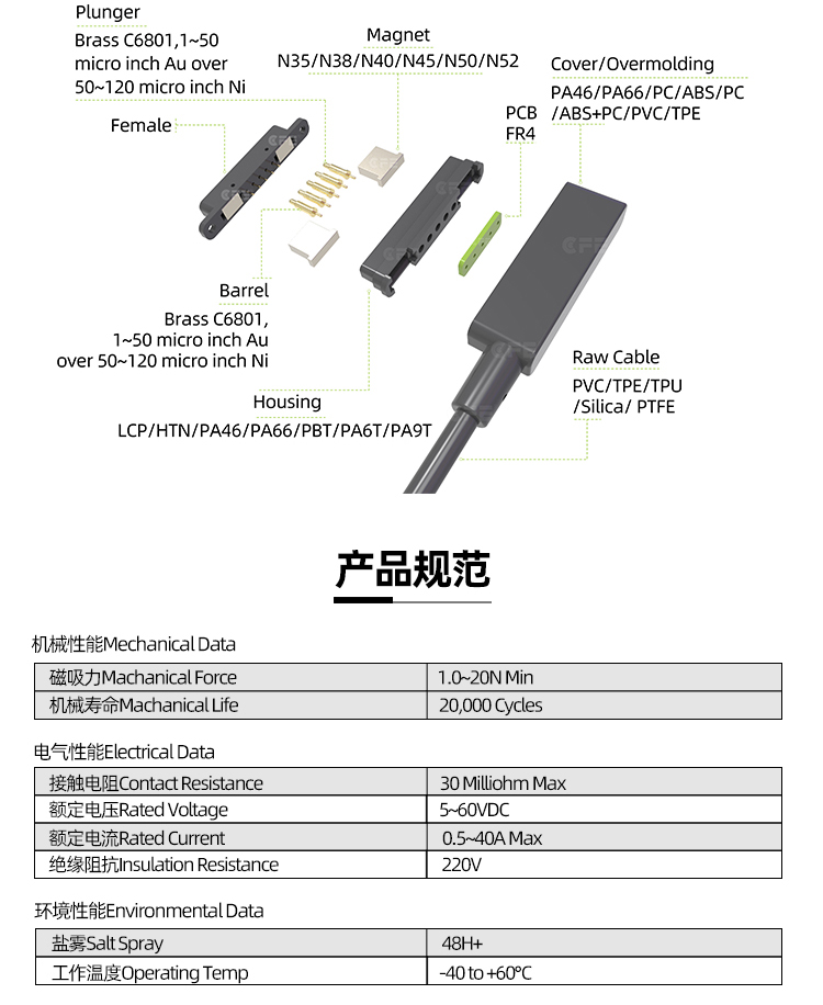 El conector magnético es una combinación de imanes sobre la base del conector pin pogo, y el uso de imanes permanentes RuFeB garantiza una conexión estable y confiable entre el macho y la hembra. El conector pogopin magnético compensa las ventajas de inserción conveniente, seguridad, tamaño compacto, fácil limpieza y extracción lateral de las que carecen los conectores tradicionales, y realmente realiza un posicionamiento 100% automático, conexión automática, inserción rápida, separación por una fuerza externa, forzado. la desconexión no dañará el puerto de conexión y otras funciones del dispositivo; se ha popularizado rápidamente y se ha utilizado en muchos campos.